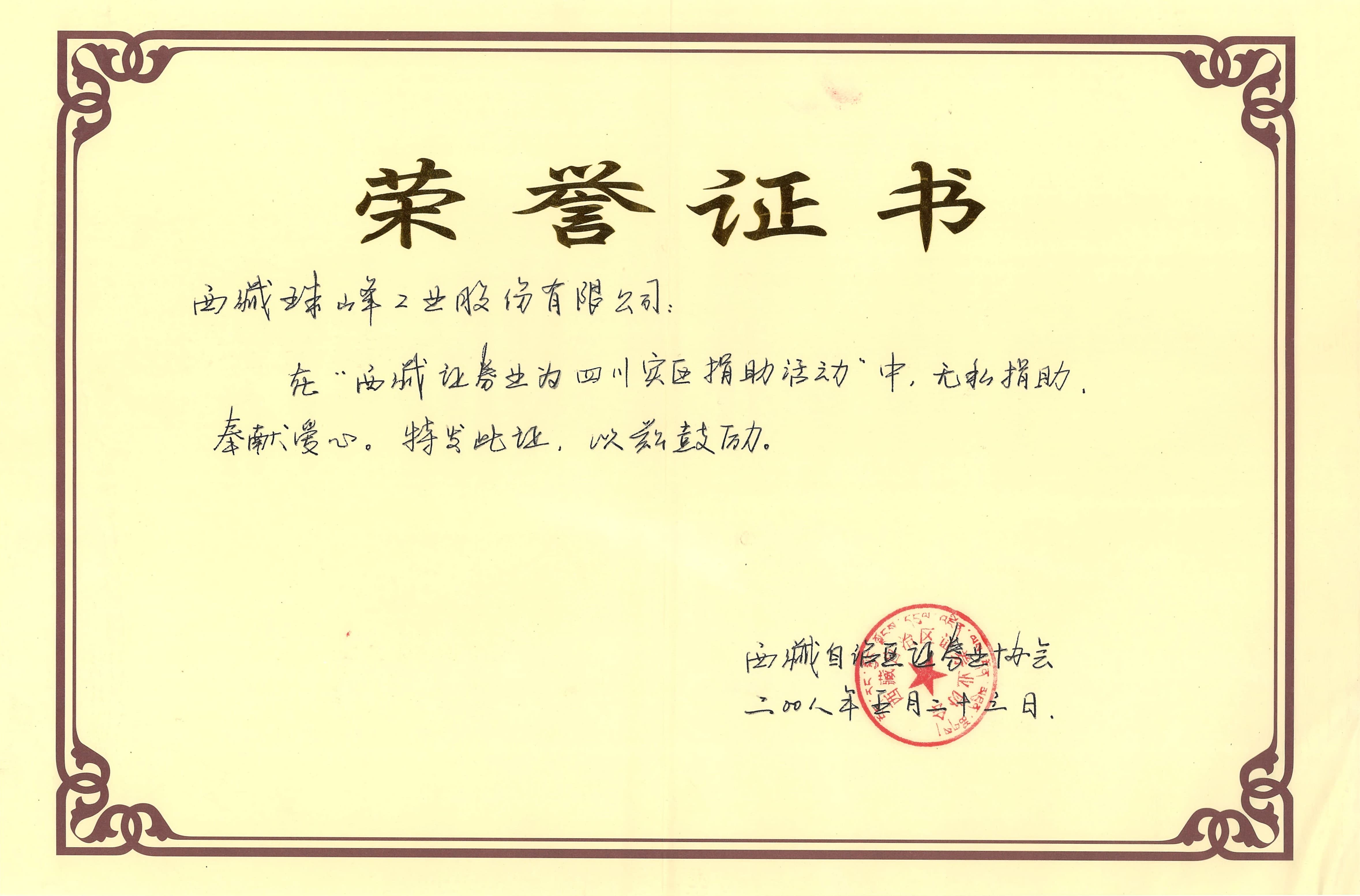 四川災區捐助活動榮譽證書